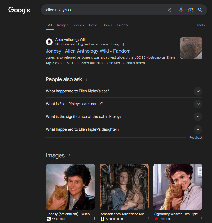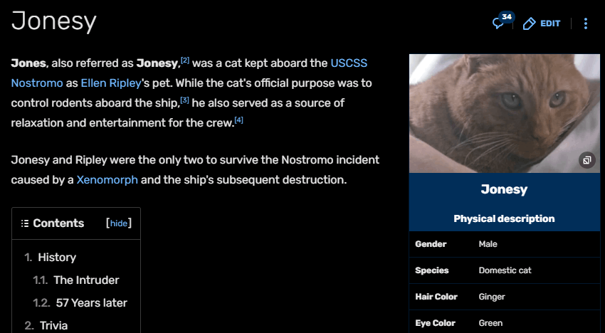 We found that a cat named Jonesy actually appears in Ellen Ripley's history