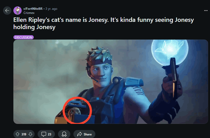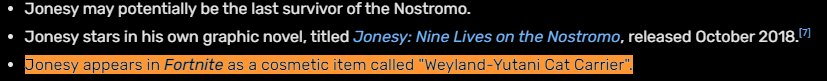 Indeed, she owned a cat named Jonesy, and more research revealed that the cat had also appeared in Fortnite as cosmetic called "Weyland-Yutani Cat Carrier".